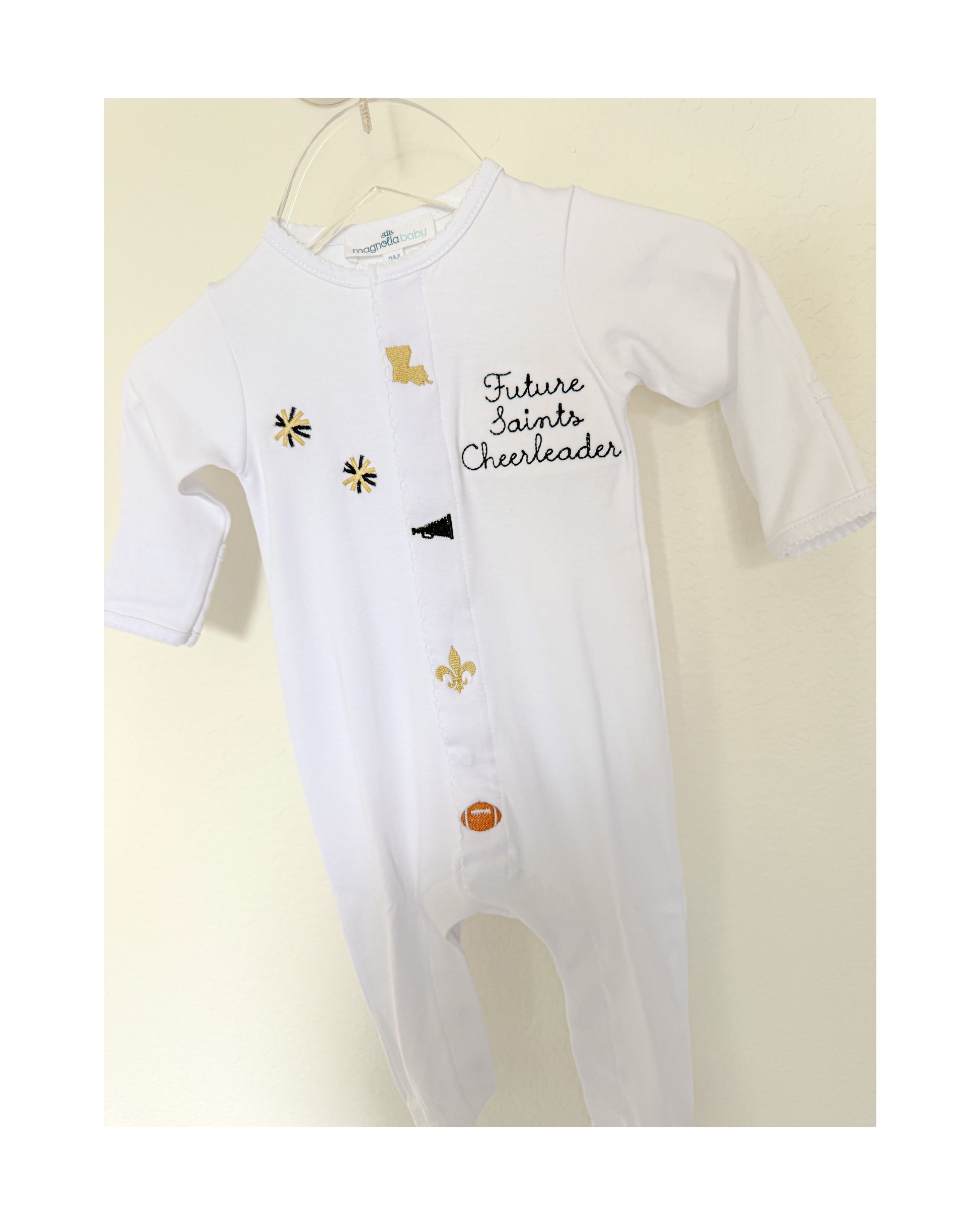 - Embroidered “Future Saints Cheerleader” with pom poms