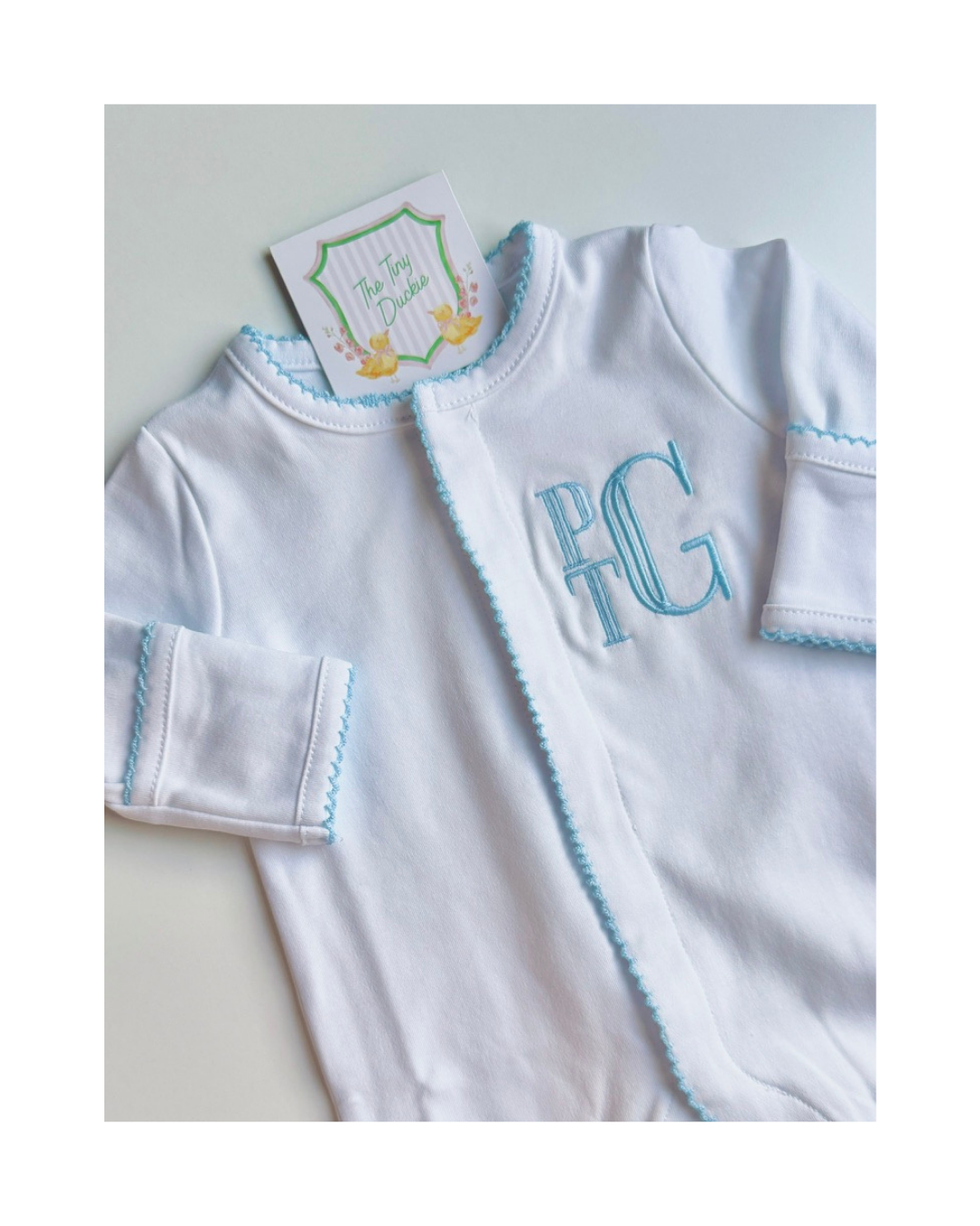 Classic baby footies made from 100% organic cotton and available in 3 picot trim colors