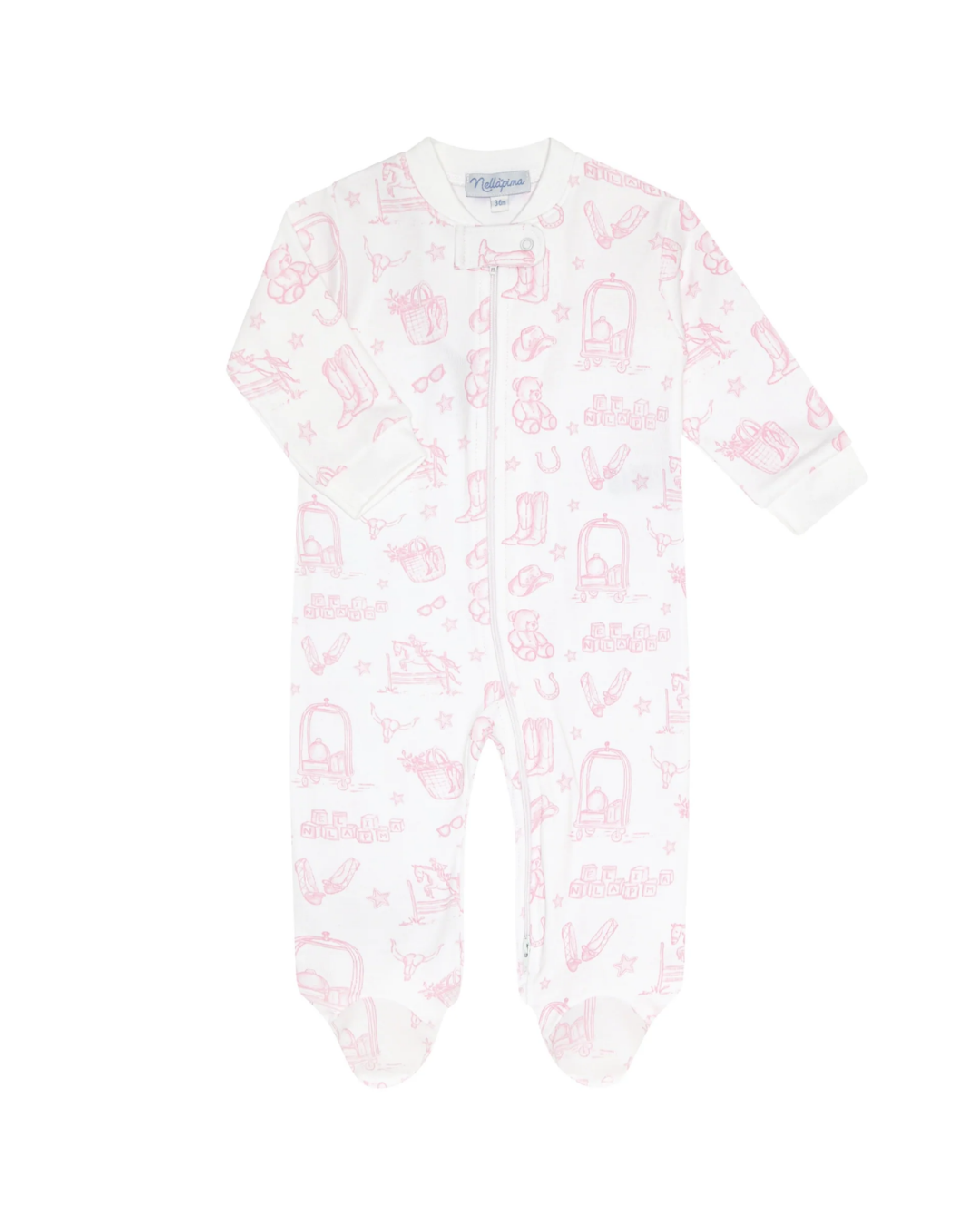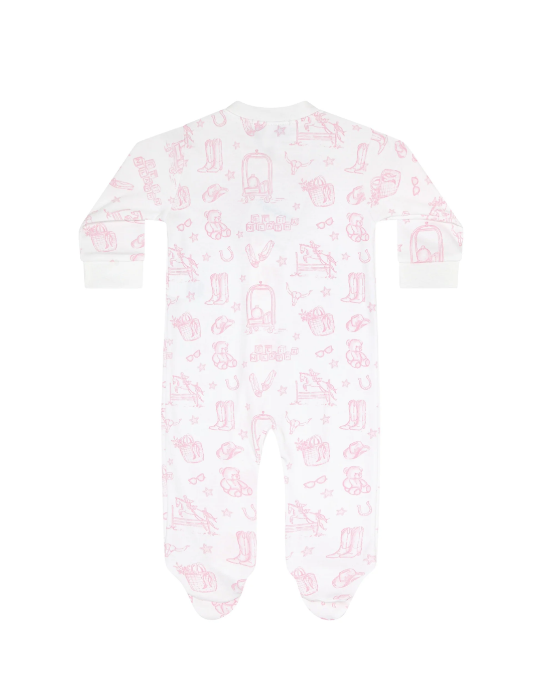Wrap your baby in comfort and frontier flair with this 2-way zipper footie in our Pink Lone Star Toile print. Made from ultra-soft 100% Peruvian Pima cotton, it’s gentle on delicate skin and perfect for sleep or play. The 2-way zipper allows for quick changes from top or bottom, making diaper changes easier than ever. Enclosed feet keep your little one warm, while the soft Western-inspired print adds a touch of character to every moment.
