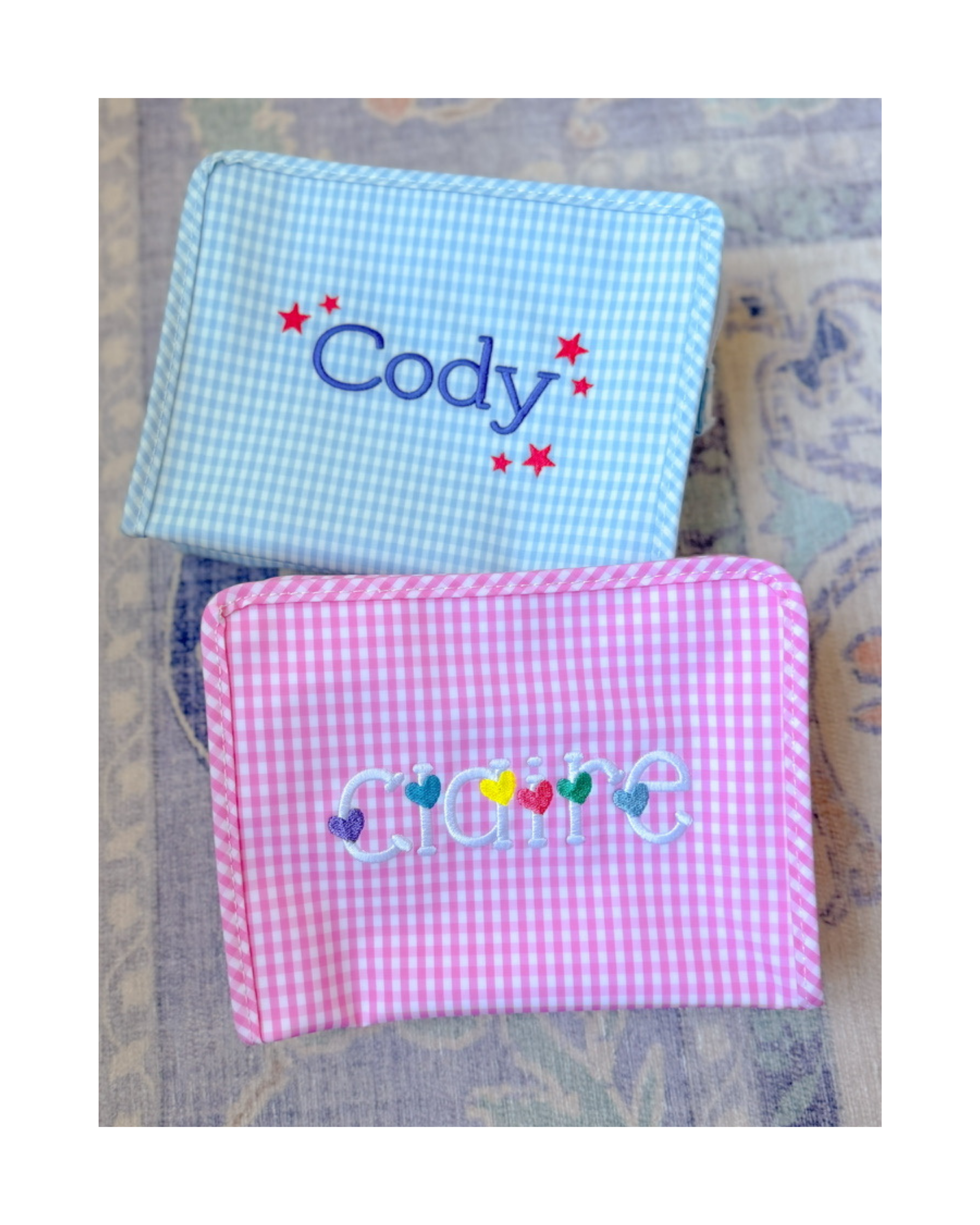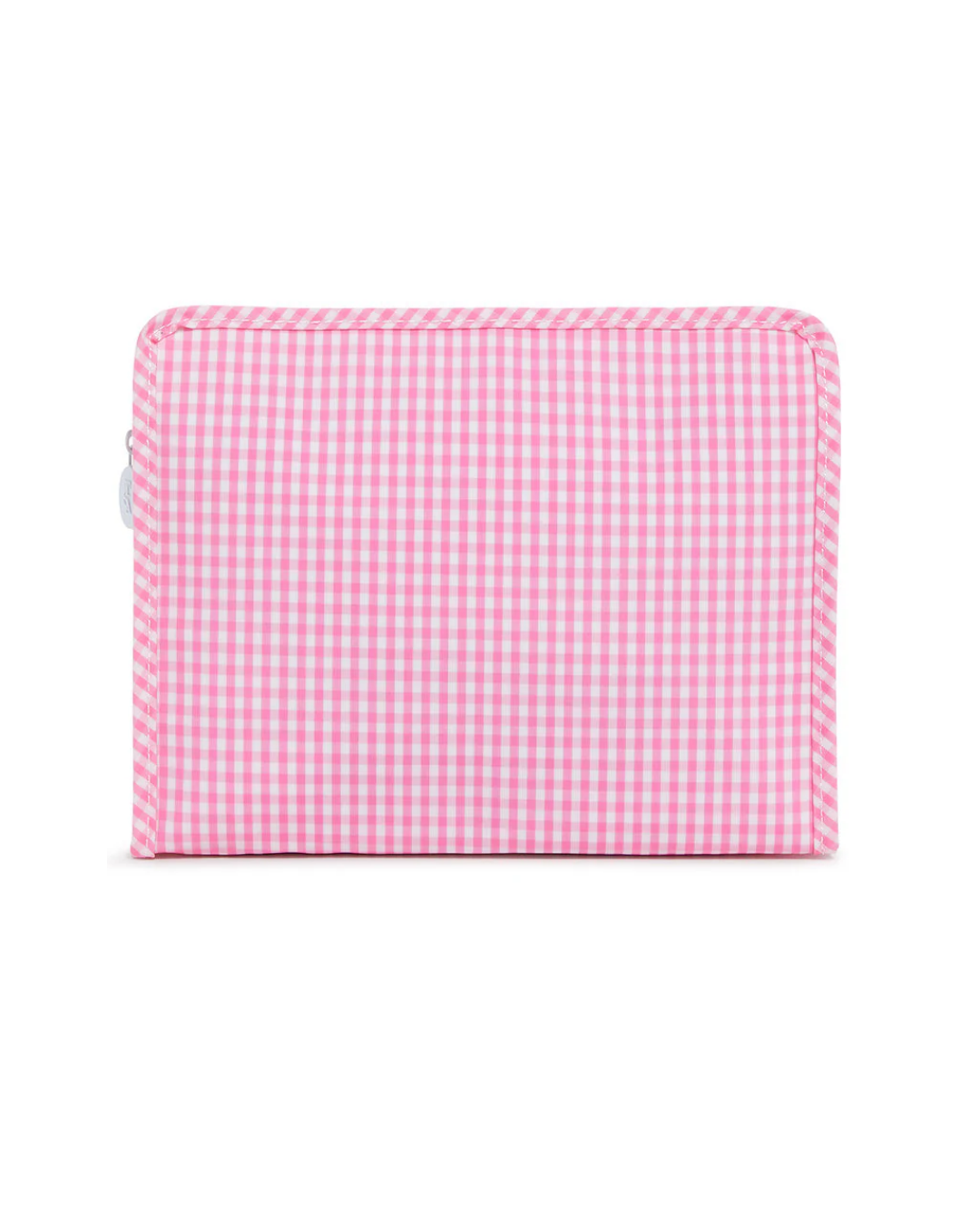 Our best-selling Roadies are made in a cotton gingham with a thin matte coating, an inside slip pocket and exterior snap open zip tabs for a wider opening and an easier access.