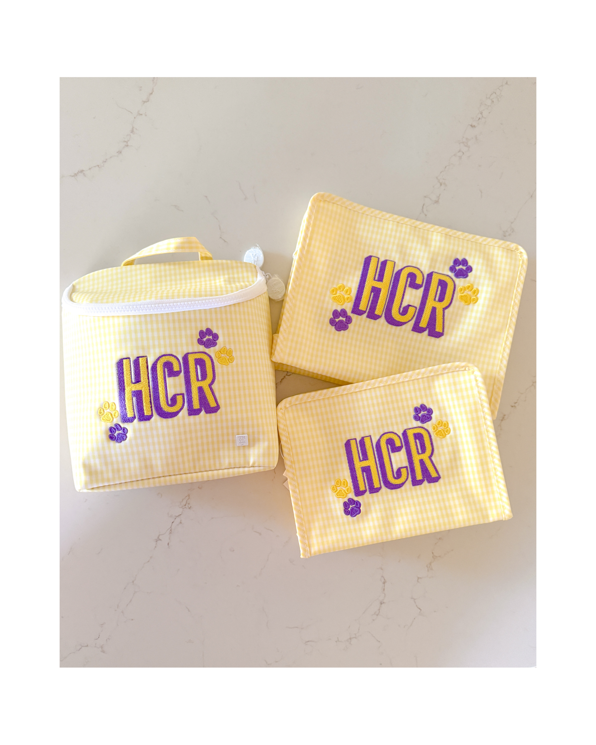 Our best-selling Roadies are made in a cotton gingham with a thin matte coating, an inside slip pocket and exterior snap open zip tabs for a wider opening and an easier access.